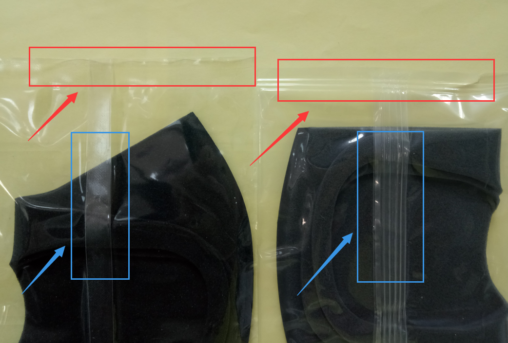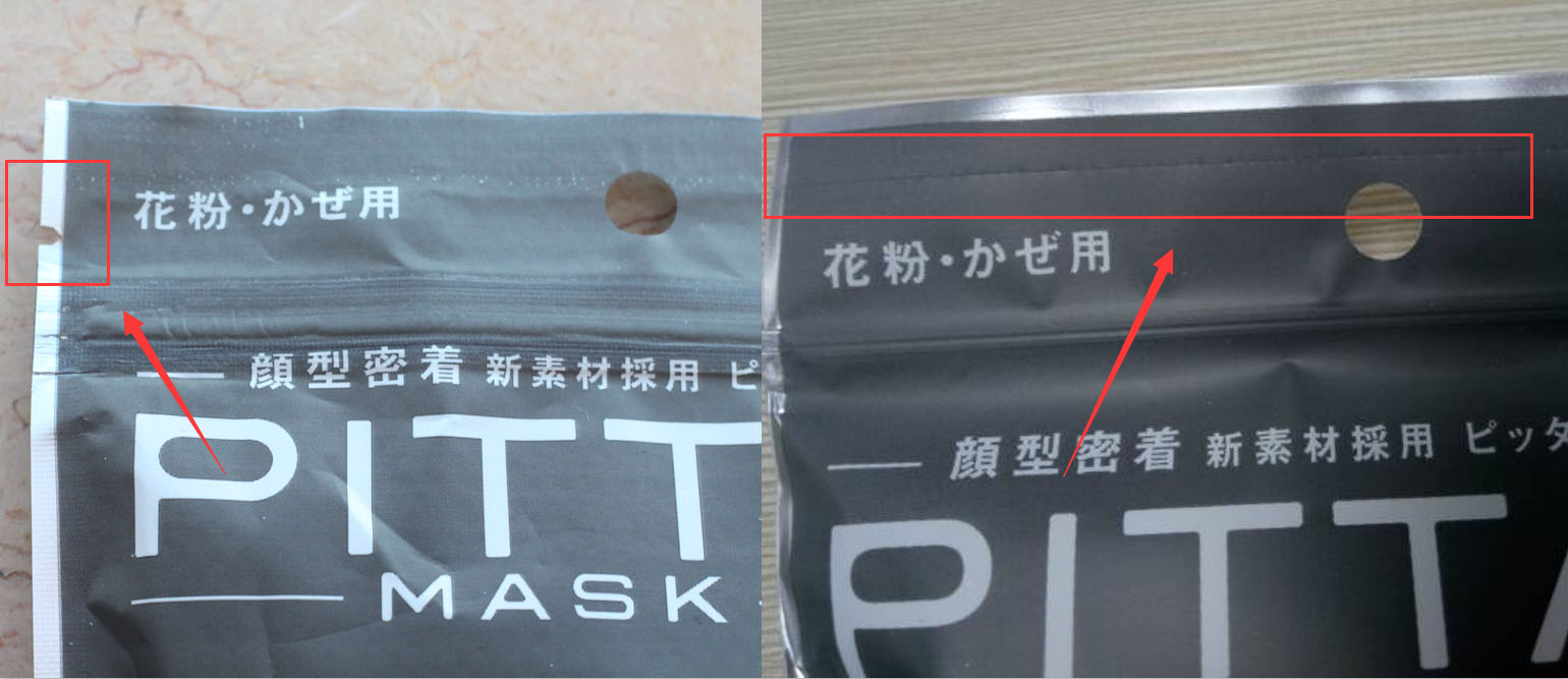 仿品:包裝不統(tǒng)一,中間熱封口和口罩耳繩折疊方向不統(tǒng)一,很隨意,工字狀的熱封采用的是普通的直接熱合,