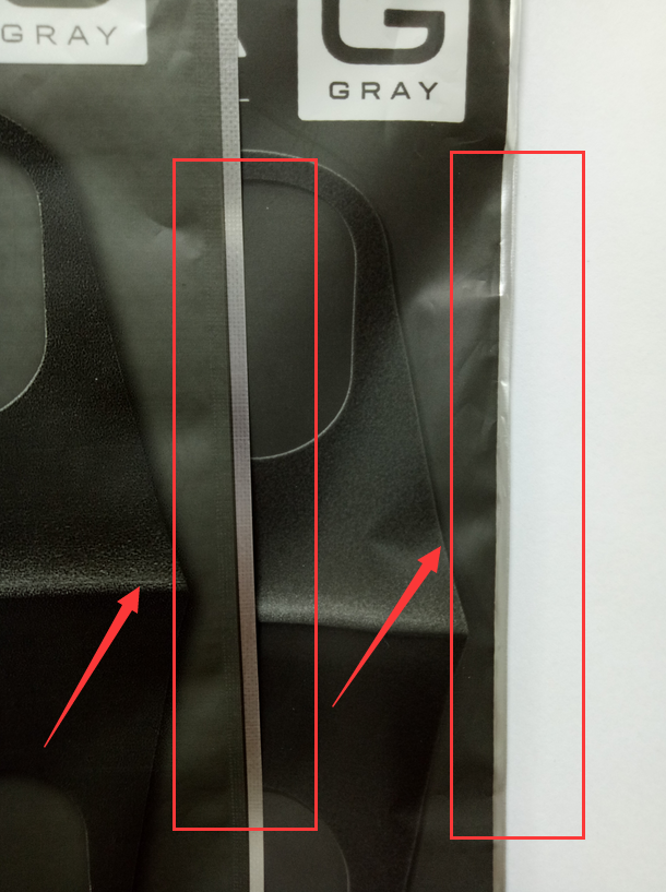 正品:自封口邊緣壓邊面積小幾乎沒有壓邊;包裝袋側(cè)邊封邊采用熱切法,邊緣幾乎無壓邊。